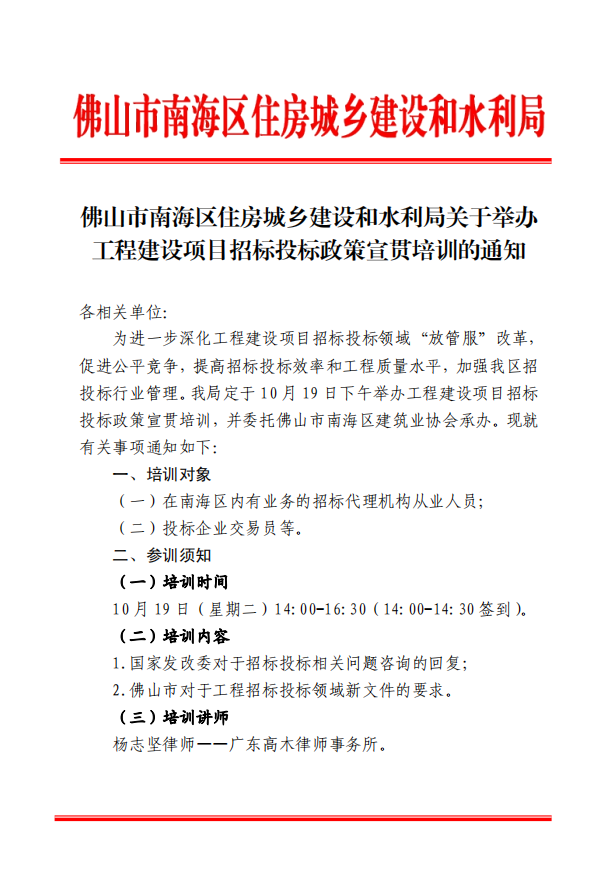 佛山市南海区住房城乡建设和水利局关于举办工程建设项目招标投标政策宣贯培训的通知