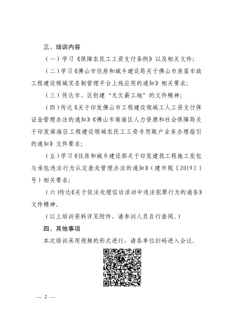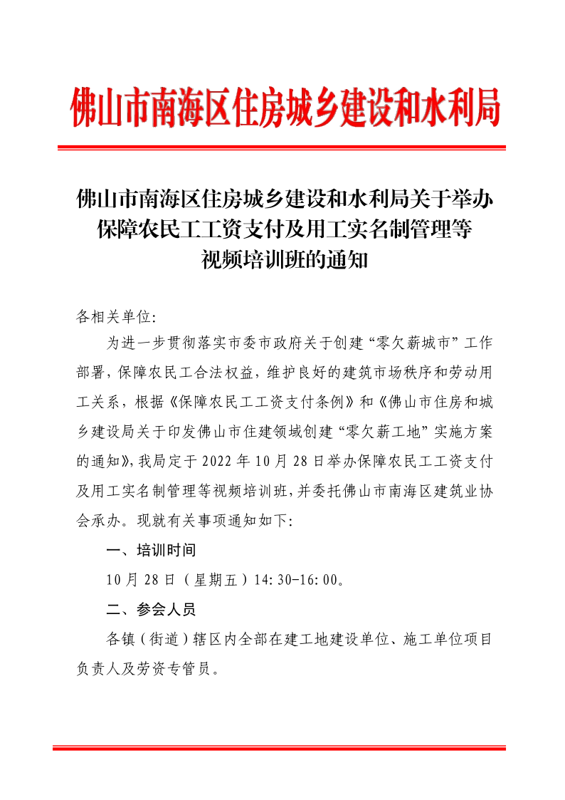 佛山市南海区住房城乡建设和水利局关于举办保障农民工工资支付及用工实名制管理等视频培训班的通知