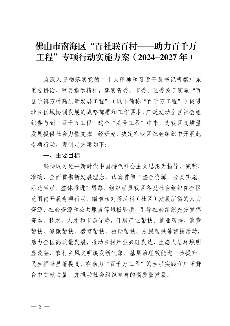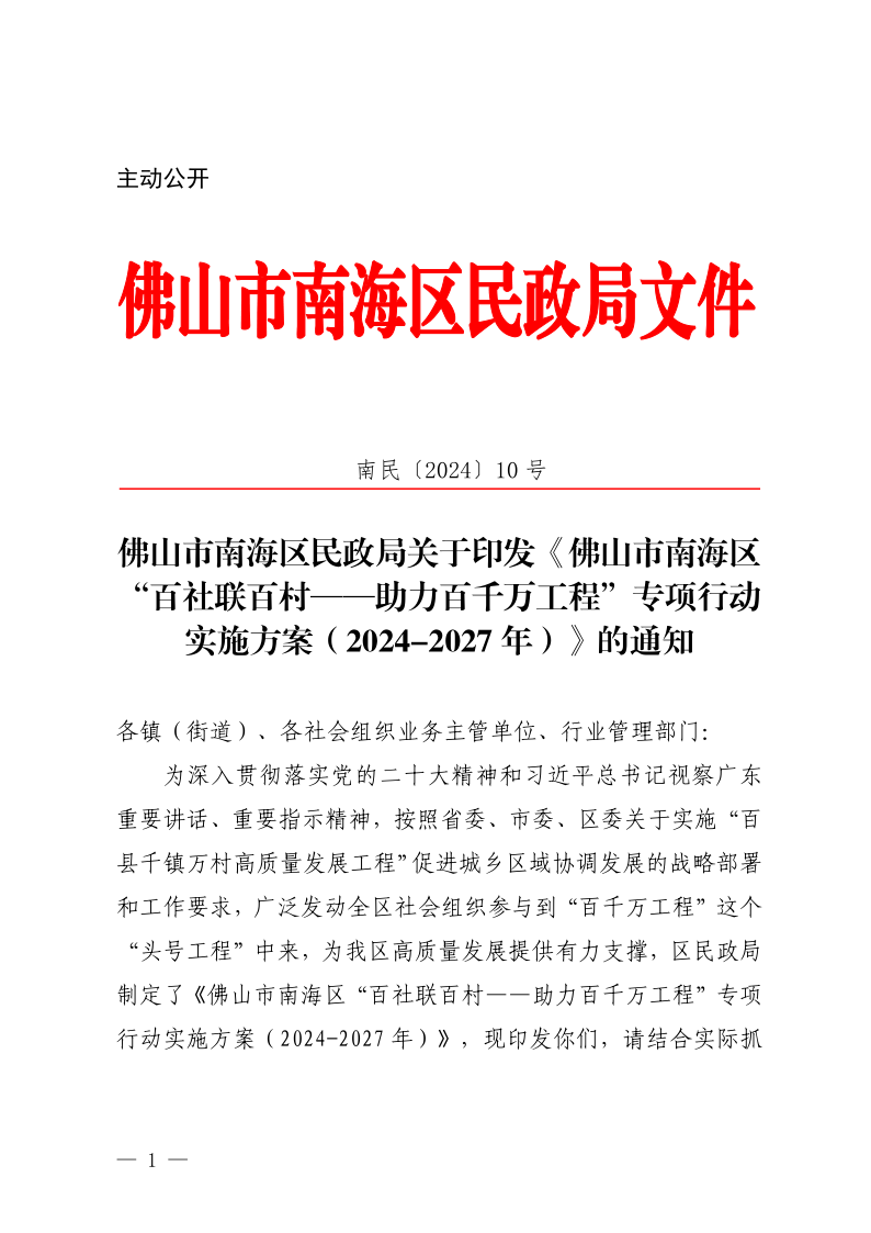 佛山市南海区民政局关于印发《佛山市南海区 “百社联百村——助力百千万工程”专项行动 实施方案(2024-2027 年)》的通知