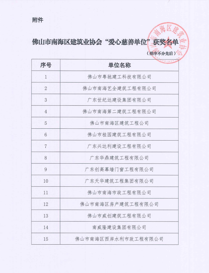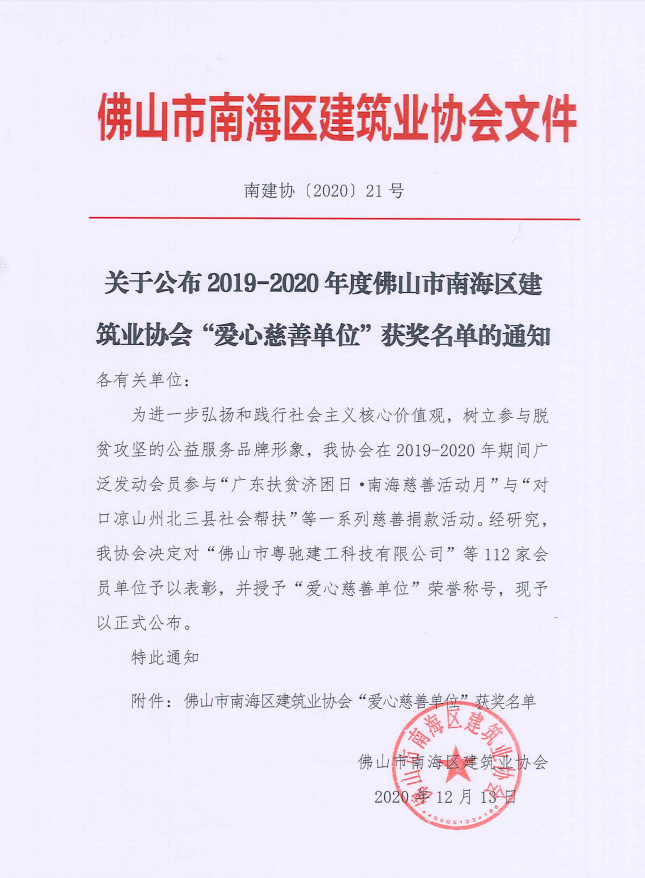 关于公布2019-2020年度佛山市南海区建筑业协会“爱心慈善单位”获奖名单的通知(南建协〔2020〕21号)