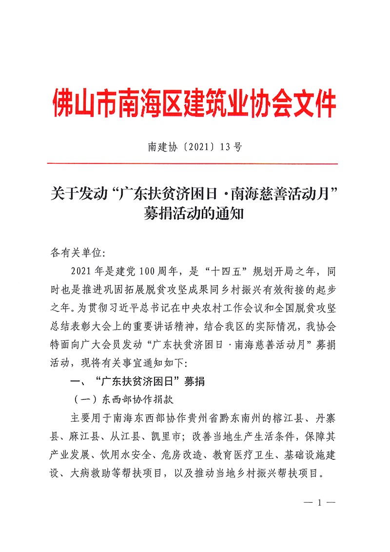 关于发动“广东扶贫济困日·南海慈善活动月”募捐活动的通知(南建协〔2021〕13号)