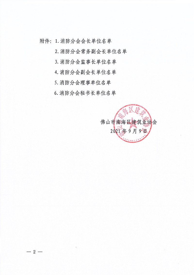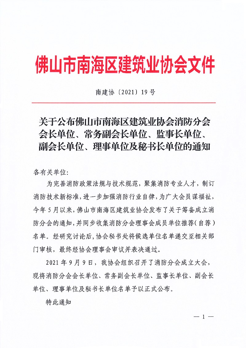 关于公布佛山市南海区建筑业协会消防分会会长单位、常务副会长单位、监事长单位、副会长单位、理事单位及秘书长单位的通知(南建协〔2021〕19号)