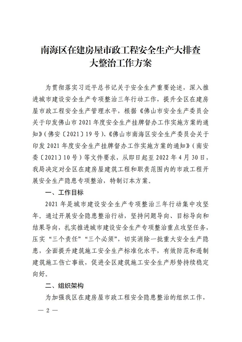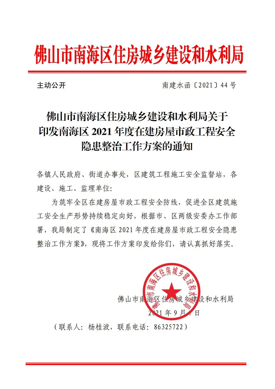 佛山市南海区住房城乡建设和水利局关于印发南海区2021年度在建房屋市政工程安全隐患整治工作方案的通知(南建水函〔2021〕44号))