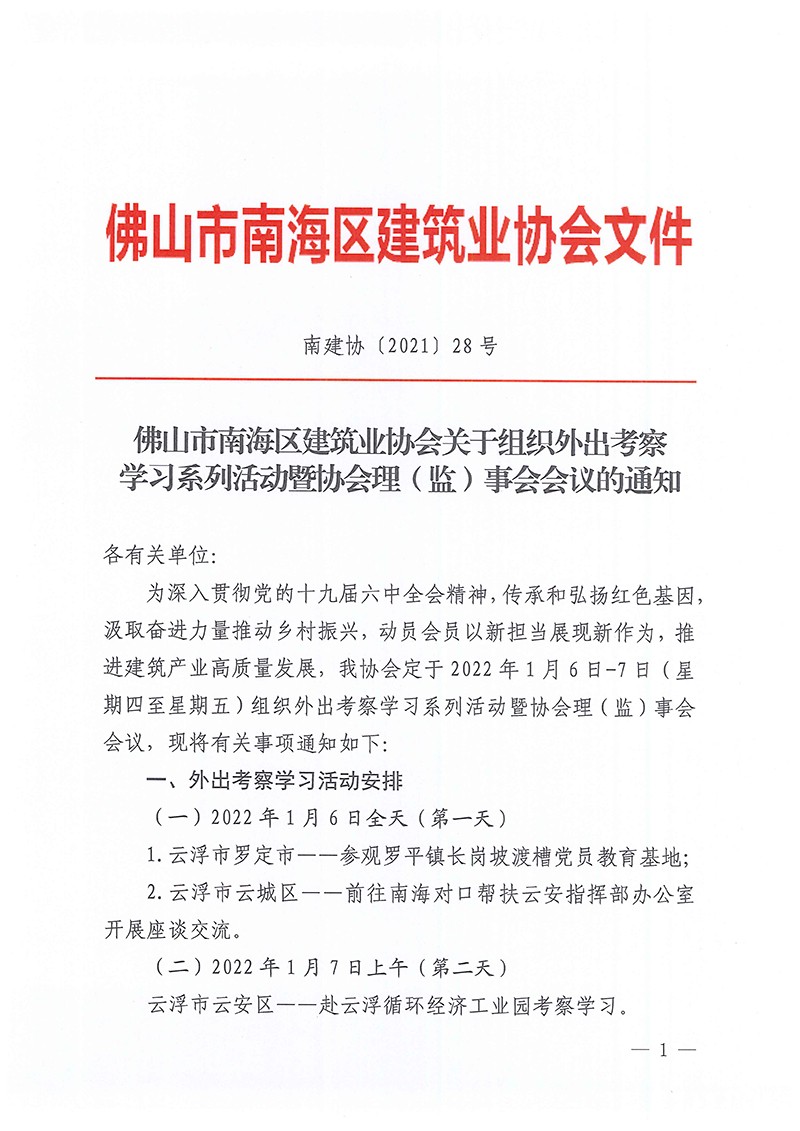 佛山市南海区建筑业协会关于组织外出考察学习系列活动暨协会理(监)事会会议的通知(南建协〔2021〕28号)