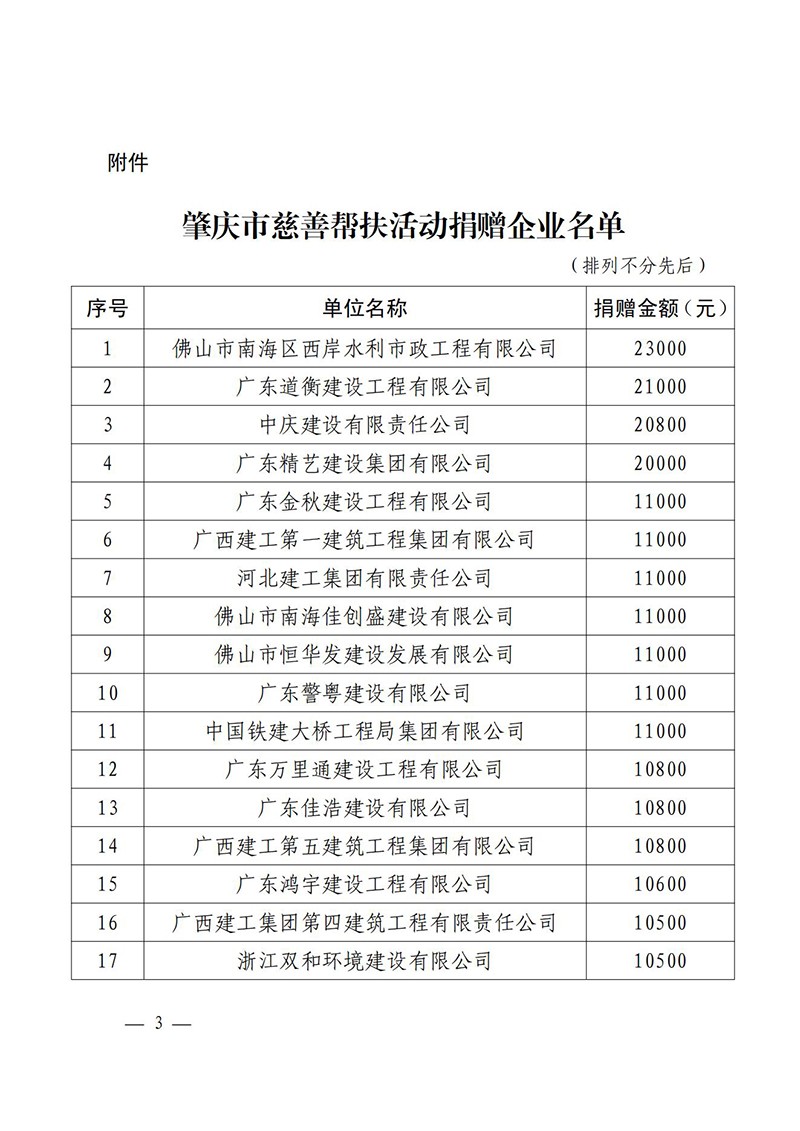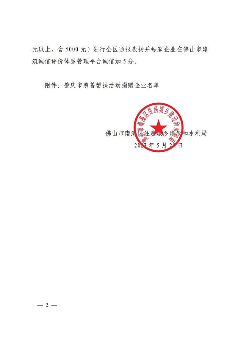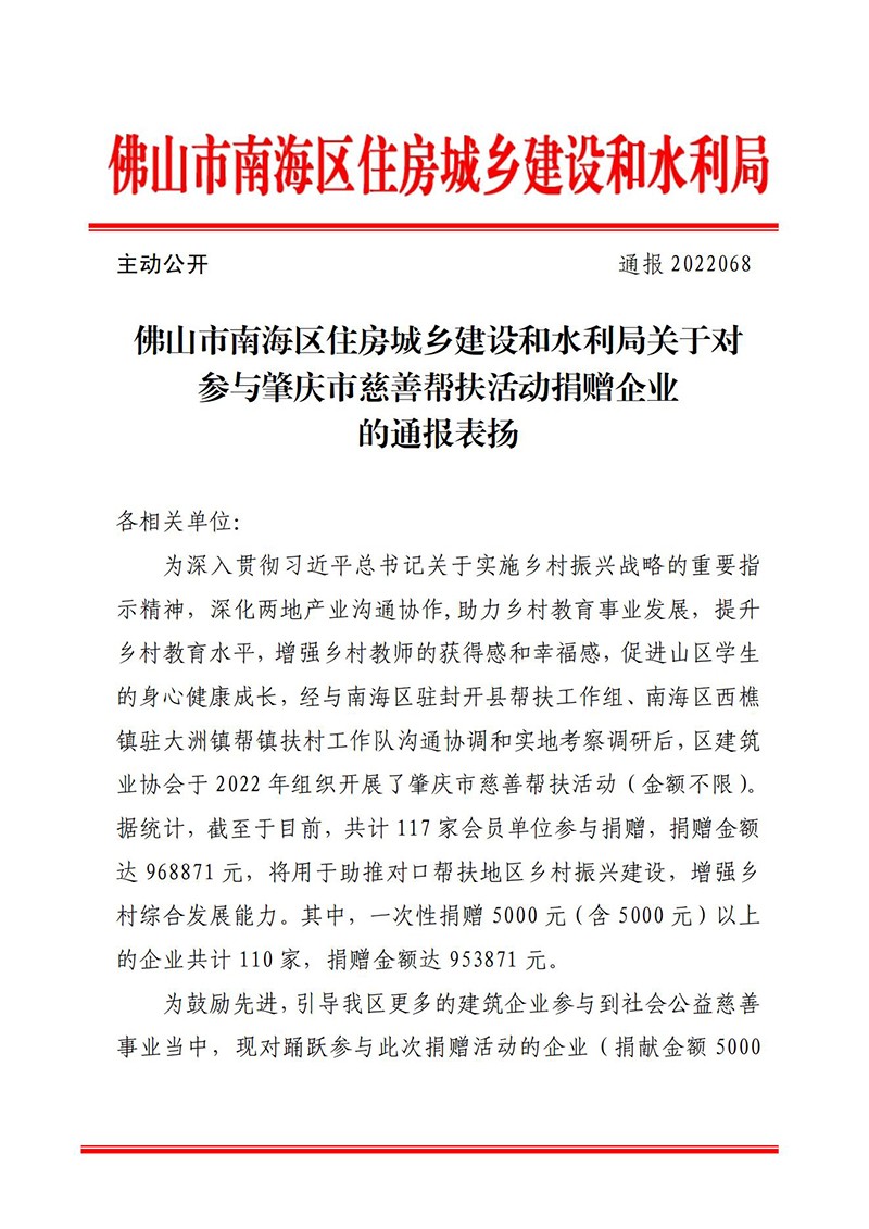 佛山市南海区住房城乡建设和水利局关于对参与肇庆市慈善帮扶活动捐赠企业的通报表扬