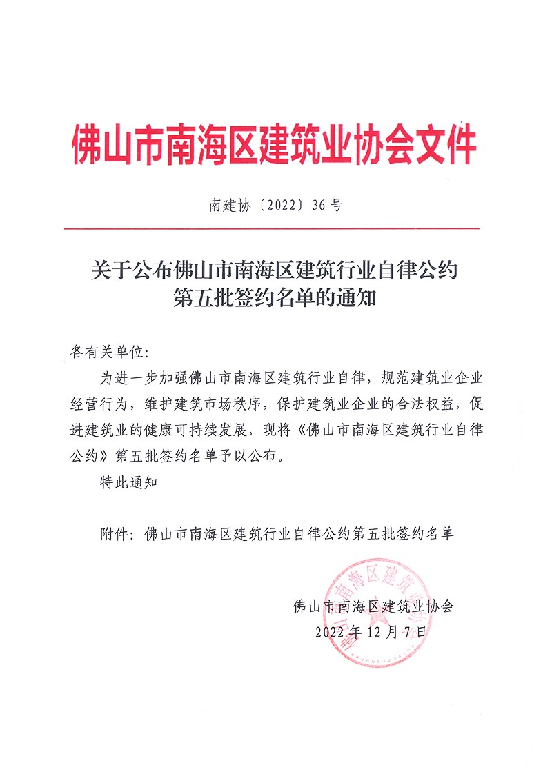 关于公布佛山市南海区建筑行业自律公约第五批签约名单的通知(南建协〔2022〕36号).pdf