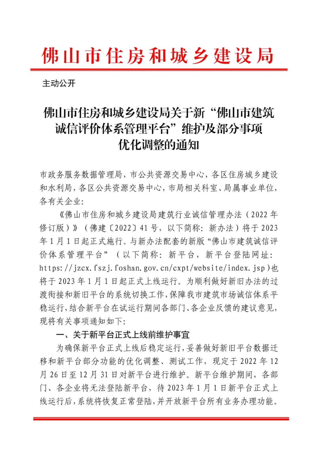 佛山市住房和城乡建设局关于新“佛山市建筑诚信评价体系管理平台”维护及部分事项优化调整的通知