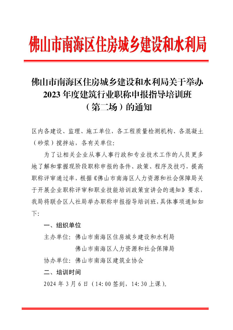 佛山市南海区住房城乡建设和水利局关于举办2023年度建筑行业职称申报指导培训班(第二场)的通知