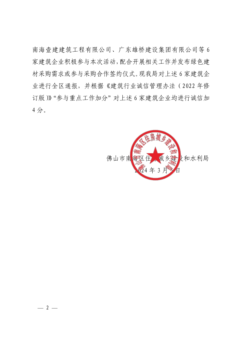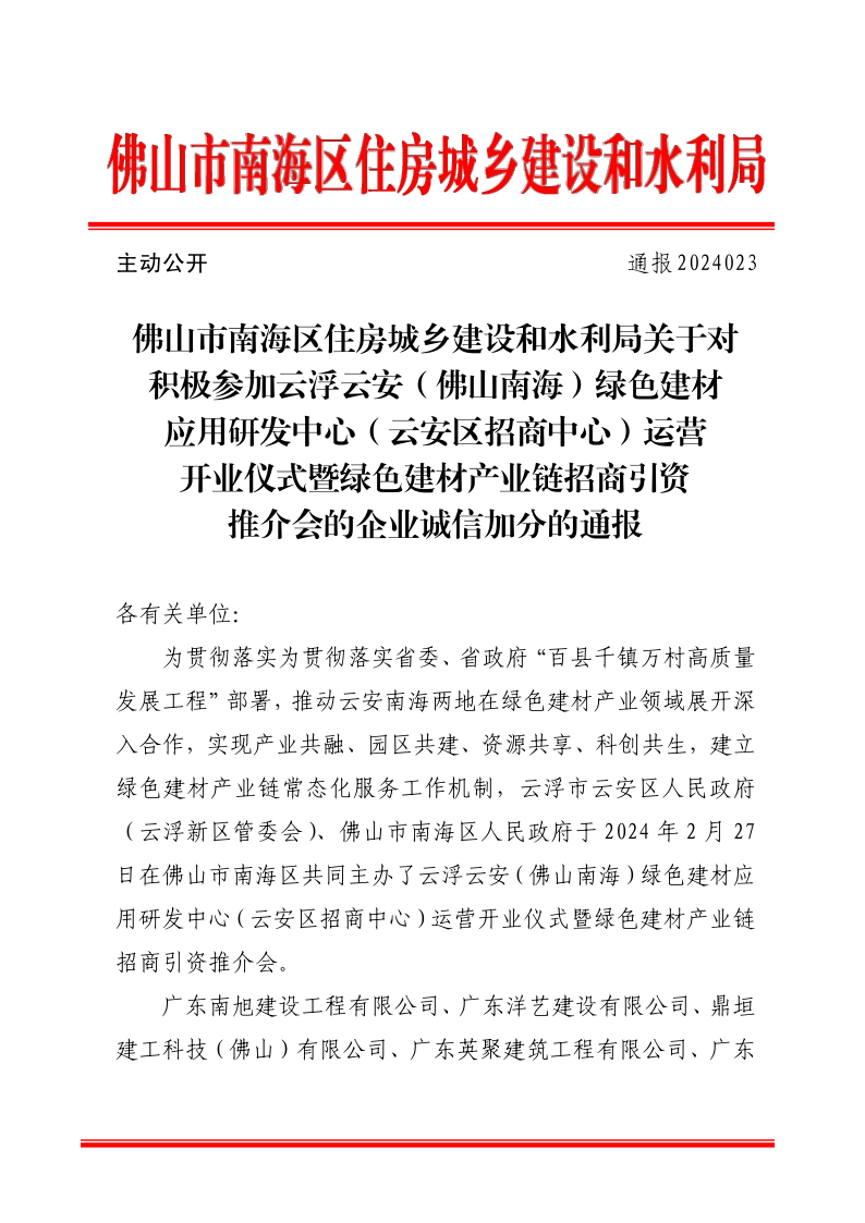 佛山市南海区住房城乡建设和水利局关于对 积极参加云浮云安(佛山南海)绿色建材 应用研发中心(云安区招商中心)运营 开业仪式暨绿色建材产业链招商引资 推介会的企业诚信加分的通报