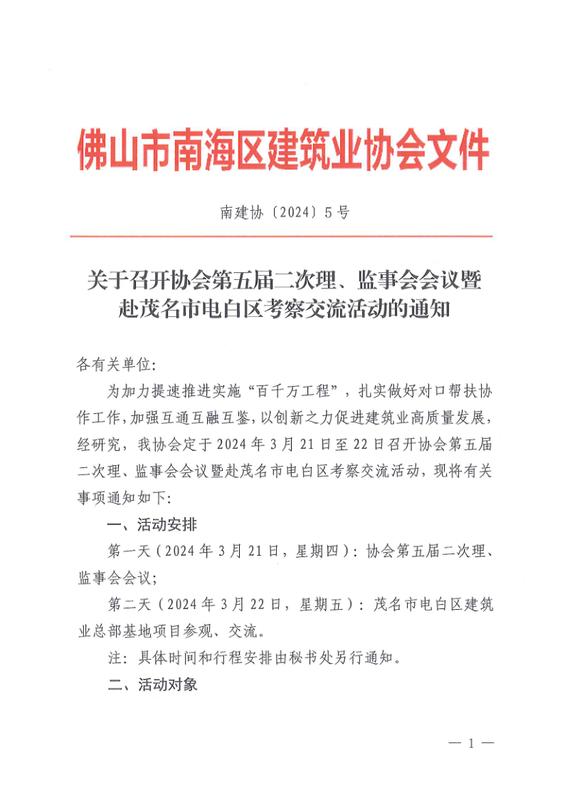 关于召开协会第五届二次理、监事会会议暨赴茂名市电白区考察交流活动的通知(南建协〔2024〕5号)