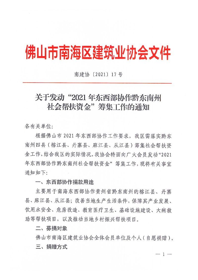 关于发动“2021年东西部协作黔东南州社会帮扶资金“筹集工作的通知(南建协〔2021〕17号)