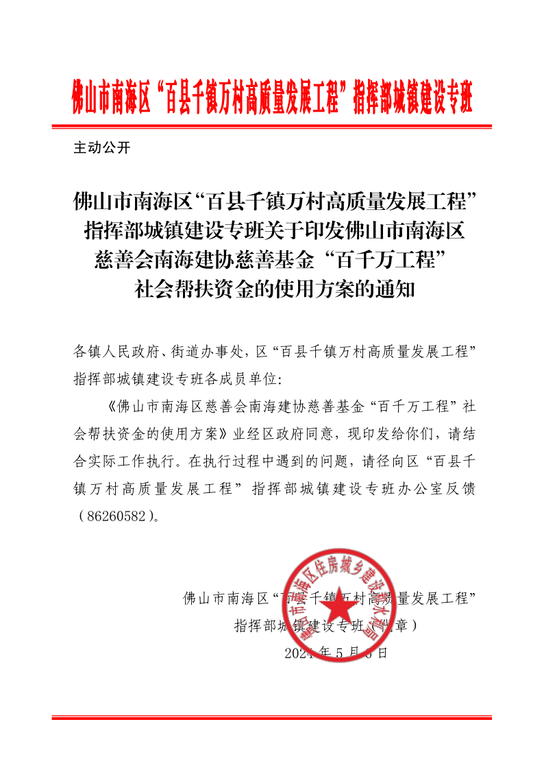 佛山市南海区“百县千镇万村高质量发展工程”指挥部城镇建设专班关于印发佛山市南海区慈善会南海建协慈善基金“百千万工程”社会帮扶资金的使用方案的通知.pdf